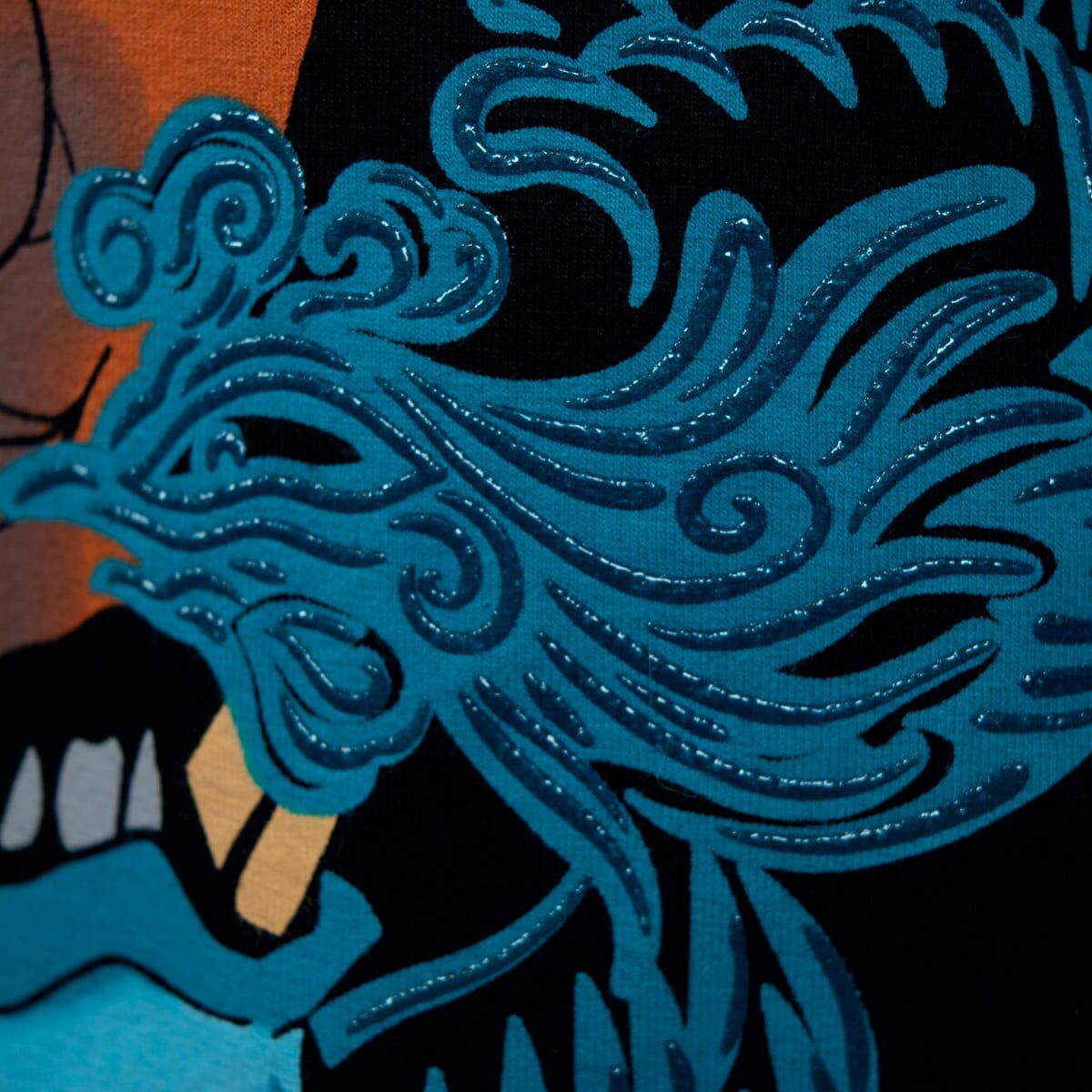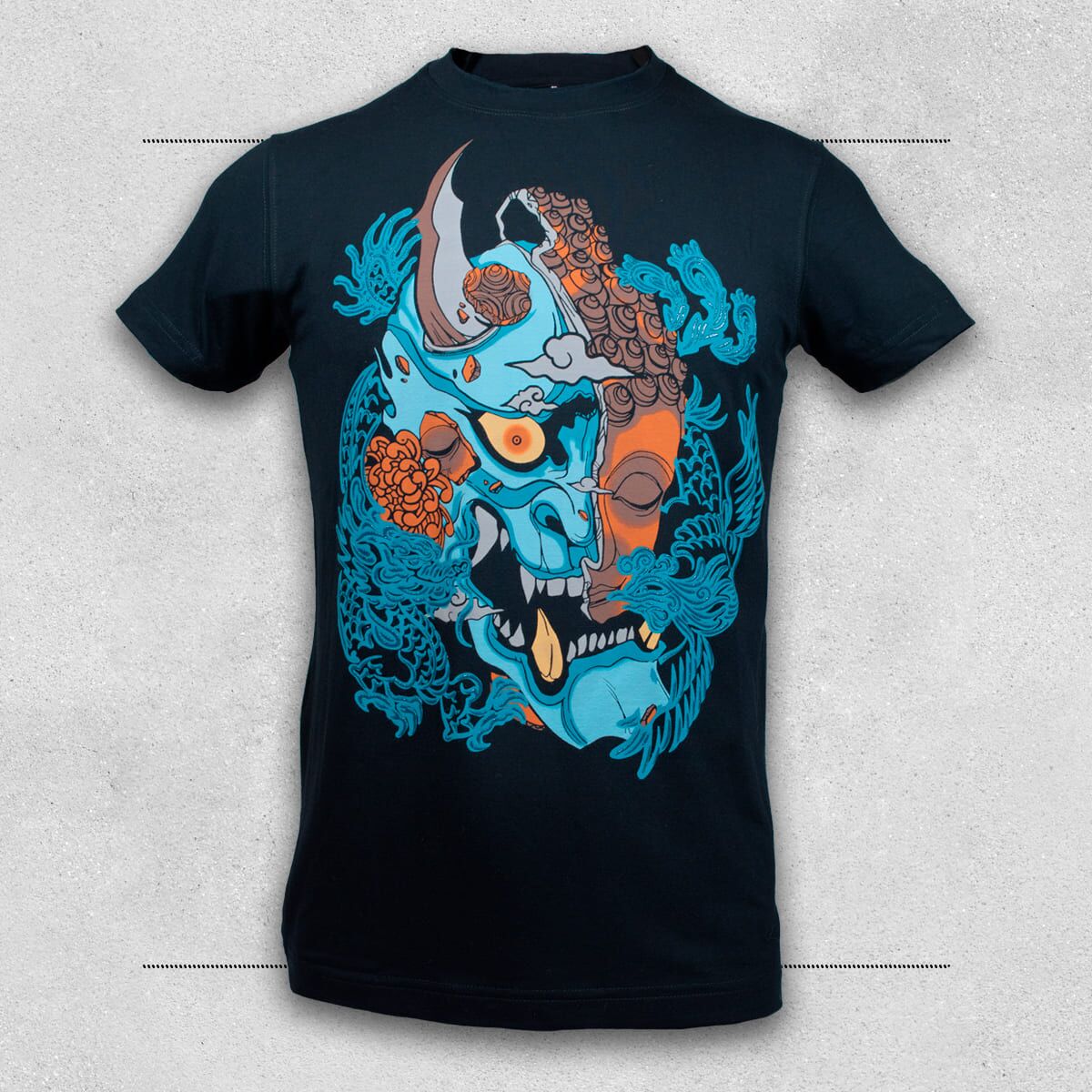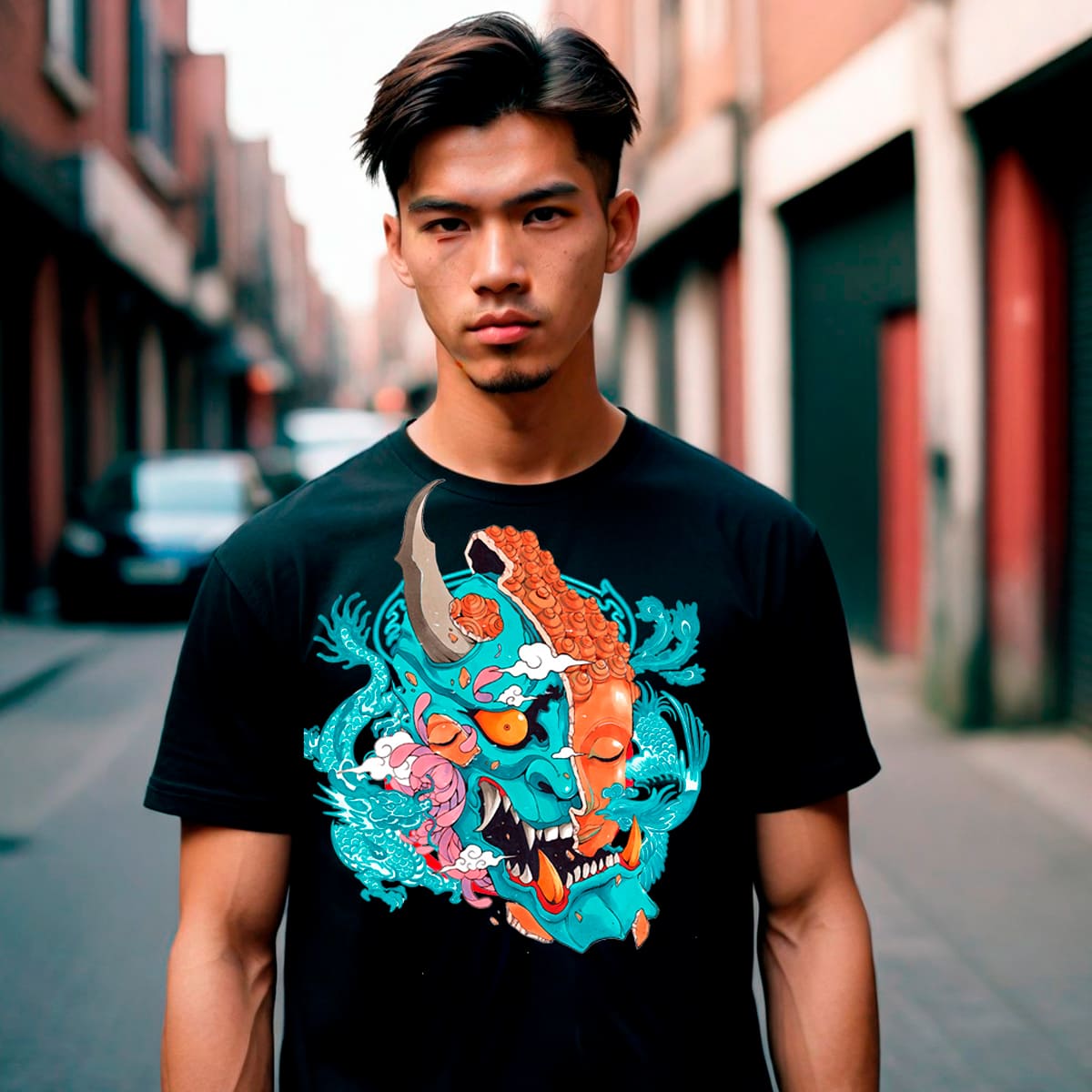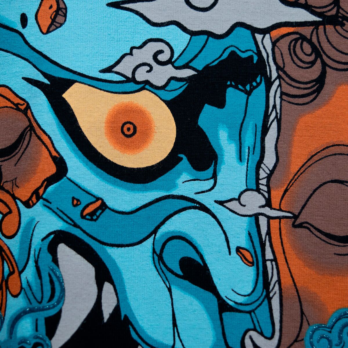 “Descubre el caos interior con este estampado impactante: una máscara de Buda se quiebra, revelando un demonio japonés que emerge de su interior. Una expresión audaz del conflicto entre la calma y la oscuridad.”